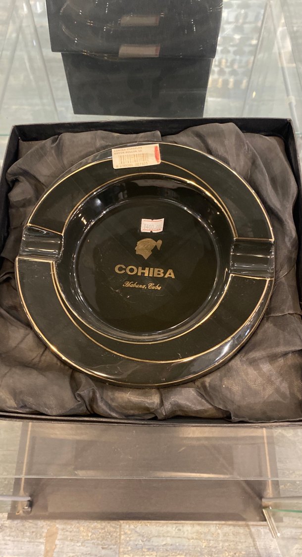 Siyah vintage kül tablası, parlak yüzeyde altın COHIBA logosu ve ince altın detaylar içerir. Klasik karşı kültür tarzını yansıtır. ️