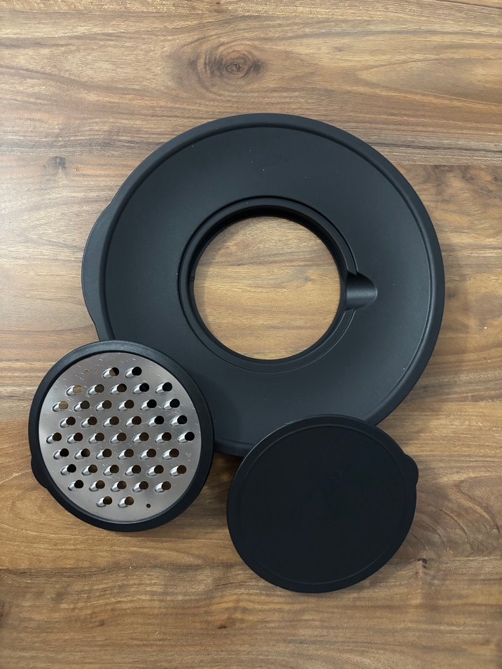 Siyah çok amaçlı mutfak rende seti; rende, kapak ve taban plakası içerir, çeşitli yiyecek hazırlıkları için uygundur.