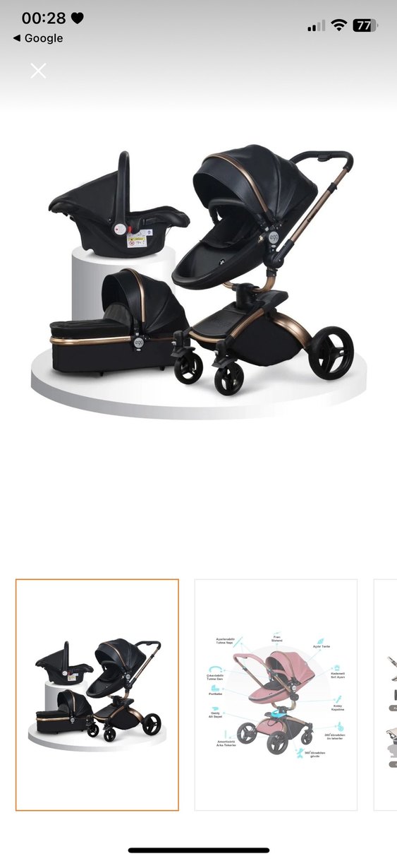 Smyrna/ iz-mir içi satışta ‼️Huggy 6 in 1 travel sistem 360 derece dönen bebek arabası 0-18kg taşıma kapasiteli. sayılı kullanıldı portbebe parçası da var o hiç kullanılmadı Siyah bebek arabası seti, araba koltuğu, beşik ve ayarlanabilir saplı tekerlekli iskelet içerir.