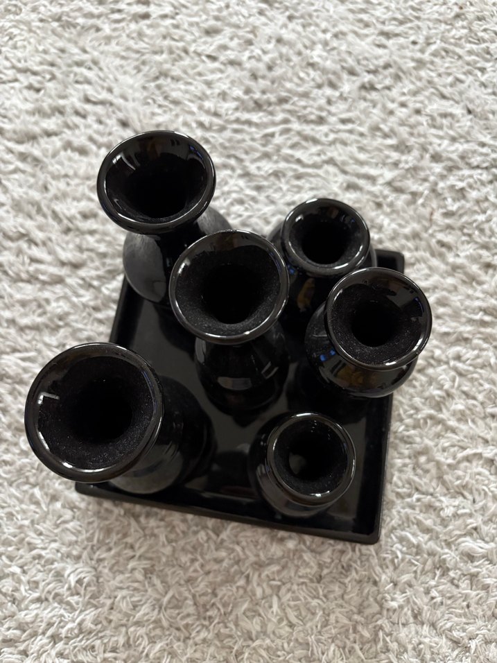 Bu siyah seramik vazo, kare taban üzerinde çoklu ağızlara sahip olup, çiçek düzenlemeleri için farklı bir tasarım sunar.