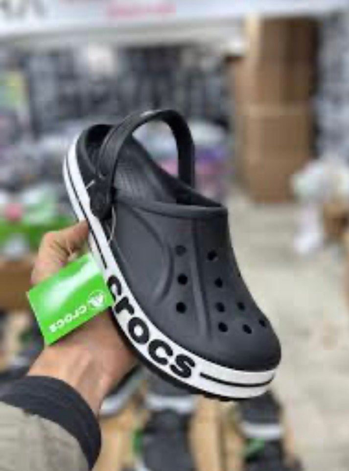 Siyah renk, bantlı ve baskılı Crocs erkek terlik. Günlük sokak stili için uygun, dayanıklı kauçuk malzemeden üretilmiştir.