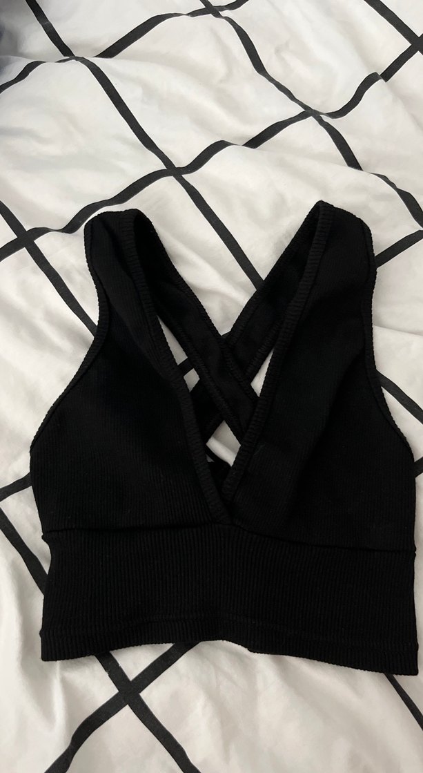 Siyah renkte, Crop . Orta uzunlukta ve çapraz askılı, desensiz ve düzgün dokulu tasarım.