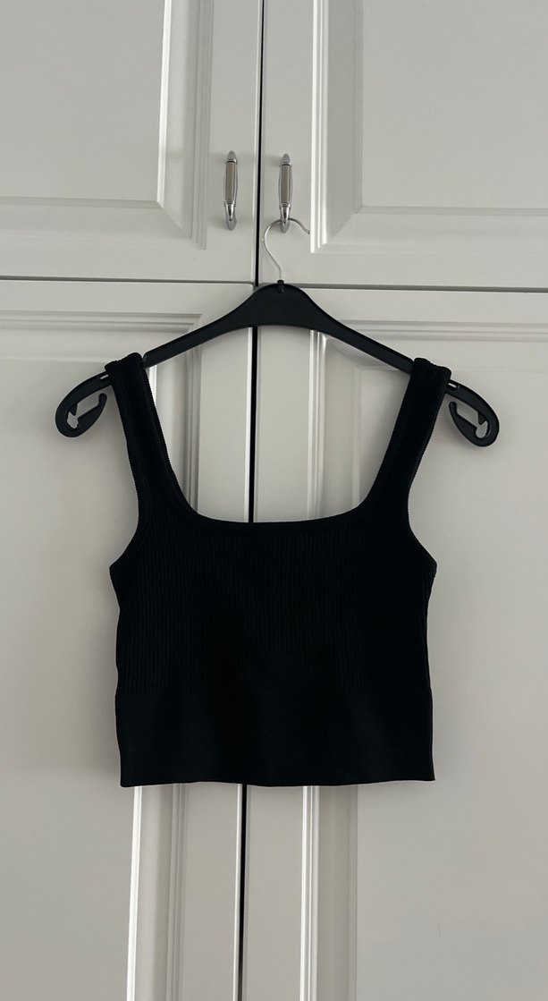 Siyah, kolsuz, düz yakalı crop. Vücuda oturan kesimiyle sokak stili ve günlük kullanım için uygundur.