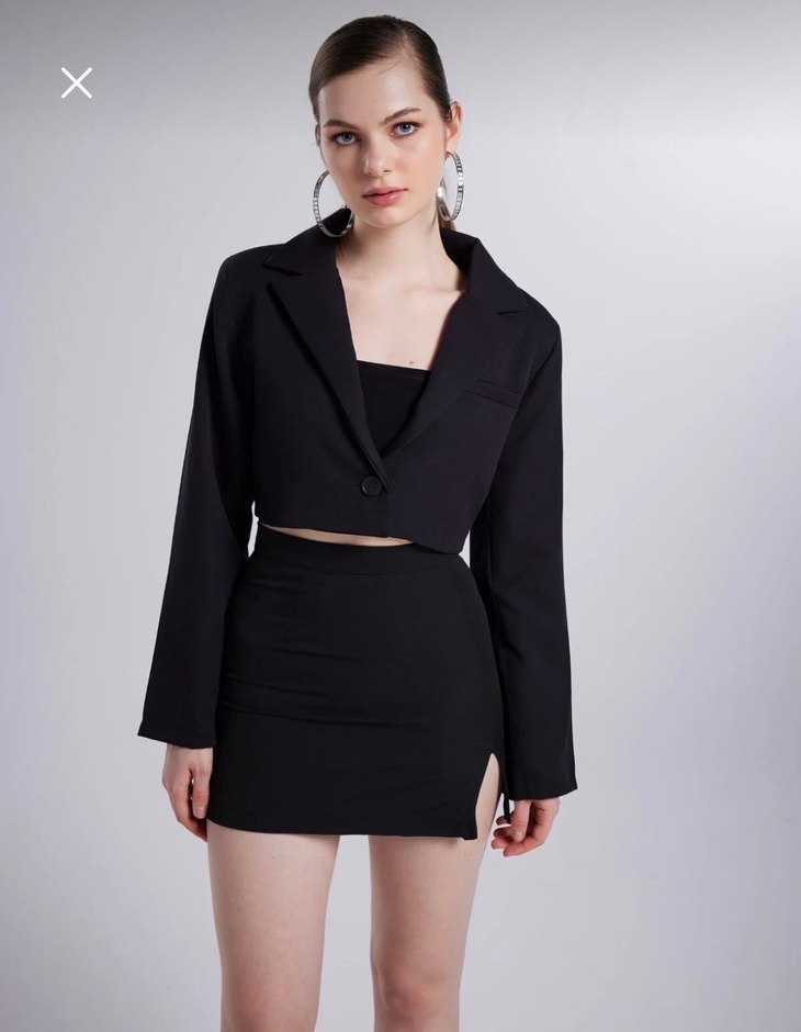 Siyah mini crop blazer, keskin yaka ve uzun kollu tasarımıyla. Rahat kesimli ve ofis için uygun şık bir parça.