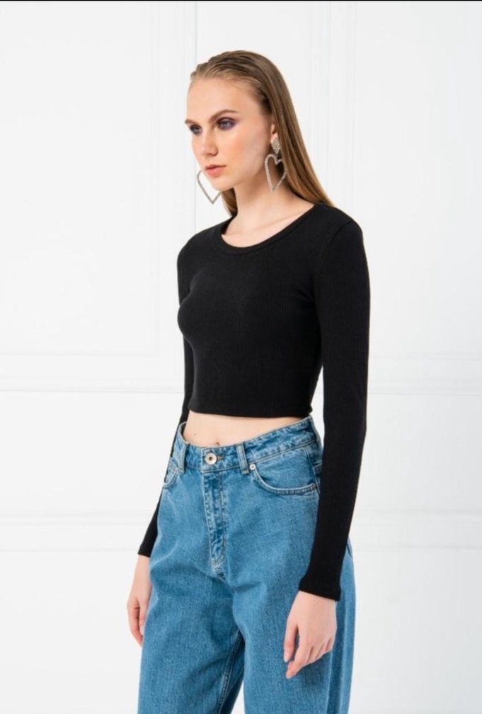 Siyah crop bluz, yuvarlak yaka ve uzun kollu,günlük sokak stili için uygundur. Hediye geldi biraz dar geldiği için satıyorum hiç giyilmedi s beden xs ve s uyumlu