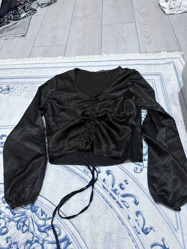 Siyah renkte, V yakalı ve uzun kollu, bol kesim mini bluz. S-M Beden