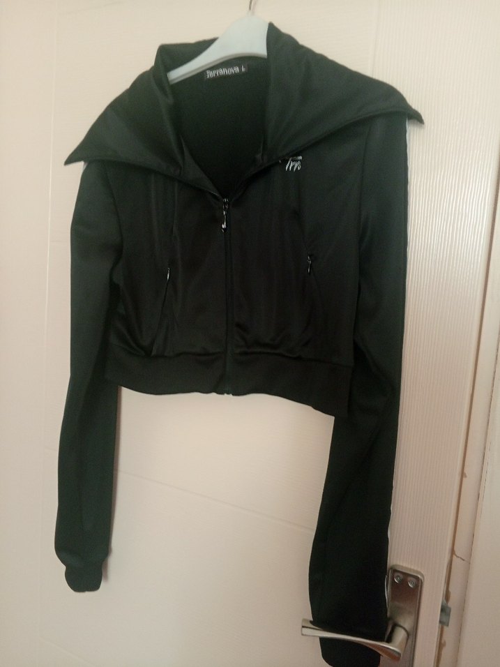 Yumuşak ve sıcak kumaştan, yüksek yakalı ve uzun kollu siyah, Crop boy, fitted kesim spor kadın ceketi. Fermuarlı ve midi boyda, günlük kullanıma uygun sokak tarzı. kusursuz. m-l uygun