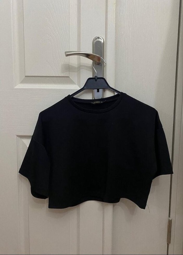 Siyah pamuklu crop top, yuvarlak yaka ve kısa kollu. Salaş kesim ve kısa boy, gündelik sokak stiline uygun. Minimalist ve çok yönlü.