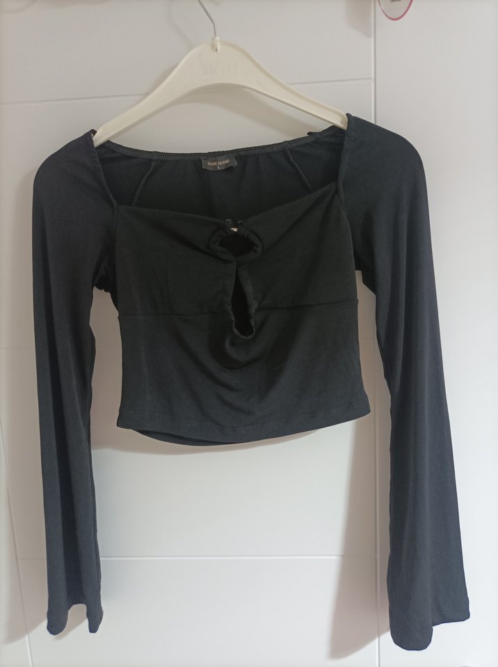 siyah crop, uzun kollu, likralı siyah bluz. Gotik tarzda, göğüs dekolteli, dış mekan kullanımı için uygun.