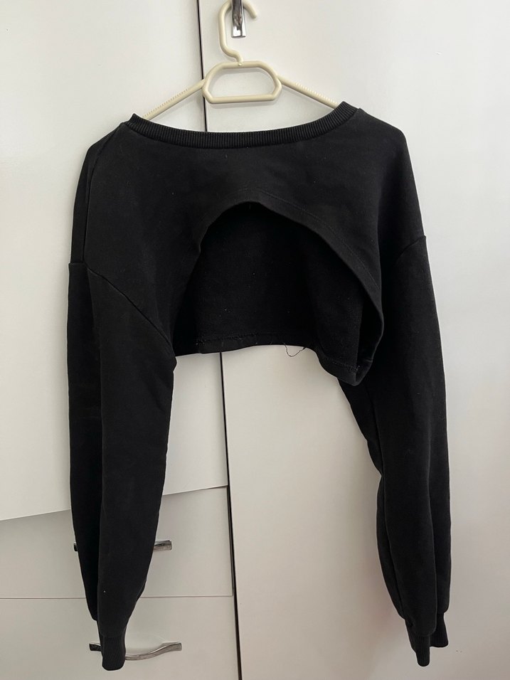 Siyah renkli, yuvarlak yaka ve uzun kollu, sentetik kumaştan yapılmış crop kesim sweatshirt. Fitted kesimi ve midi uzunluğu ile günlük kullanıma uygun, şık ve rahat bir parça.