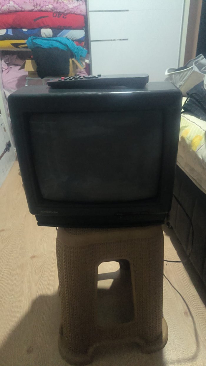 Uzun kenarlı siyah CRT monitör, üzerinde uzaktan kumanda ile birlikte.