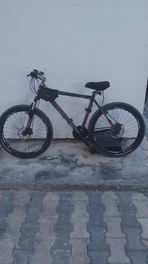 Siyah dağ bisikleti, sağlam çerçeve, ön süspansiyon ve disk frenlerle dayanıklı ve konforlu sürüş sağlar. KADRO: 26JANT ALÜMİNYUM ÖN MAŞA:ZOOM KİLİTLENEBİLİR VİTES SİSTEMİ: SHİMANO TOURNEY+ ALTUS LASTİK:KENDA AKSESUAR: SELE KILIF HIZ GÖSTERGE IŞIK KİLİT TELEFON TUTUCULU ÇANTA