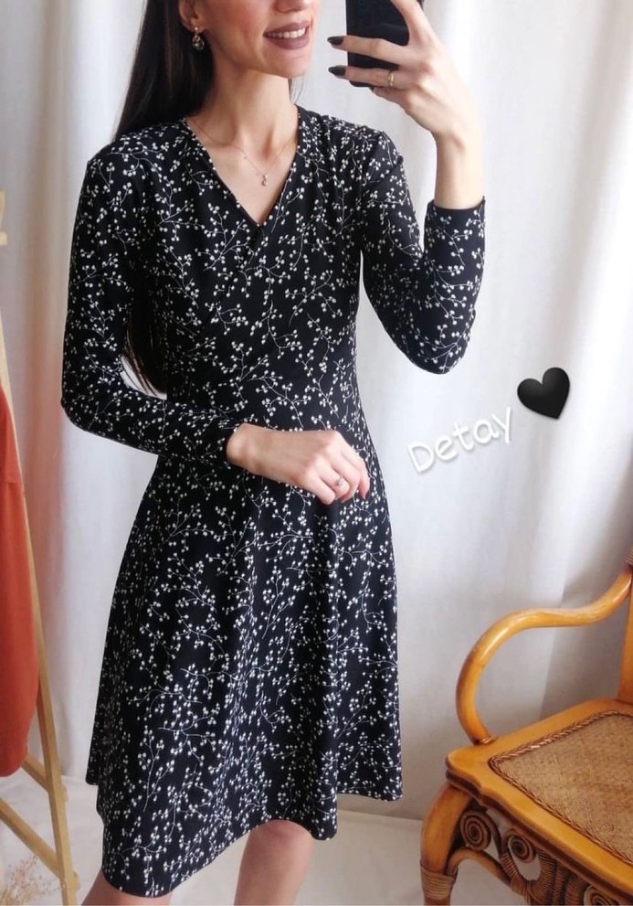 Siyah dal desenli kruvaze yaka elbise