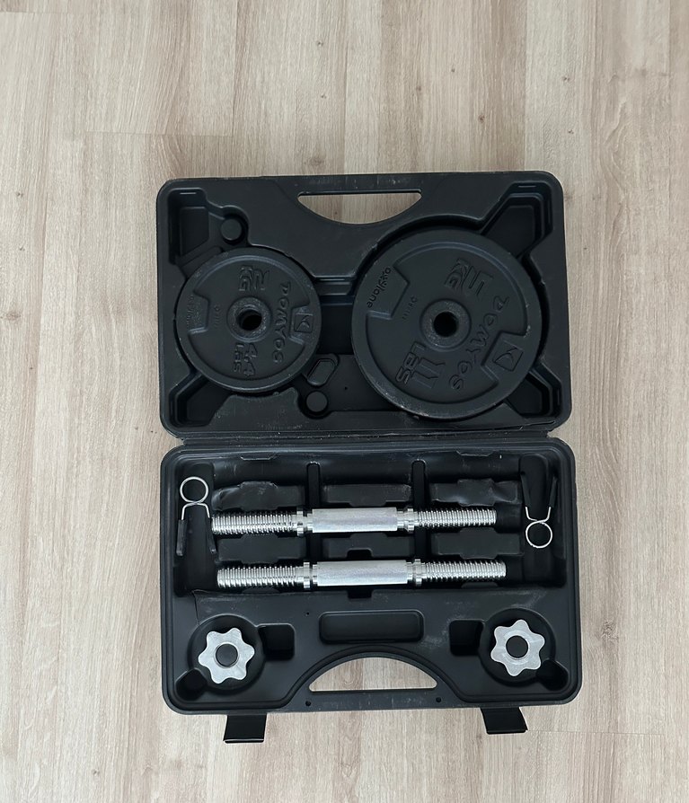 Siyah dambıl seti, ağırlıklar ve tutacaklar taşınabilir kutuda saklanır, güç antrenmanları için uygundur. ️