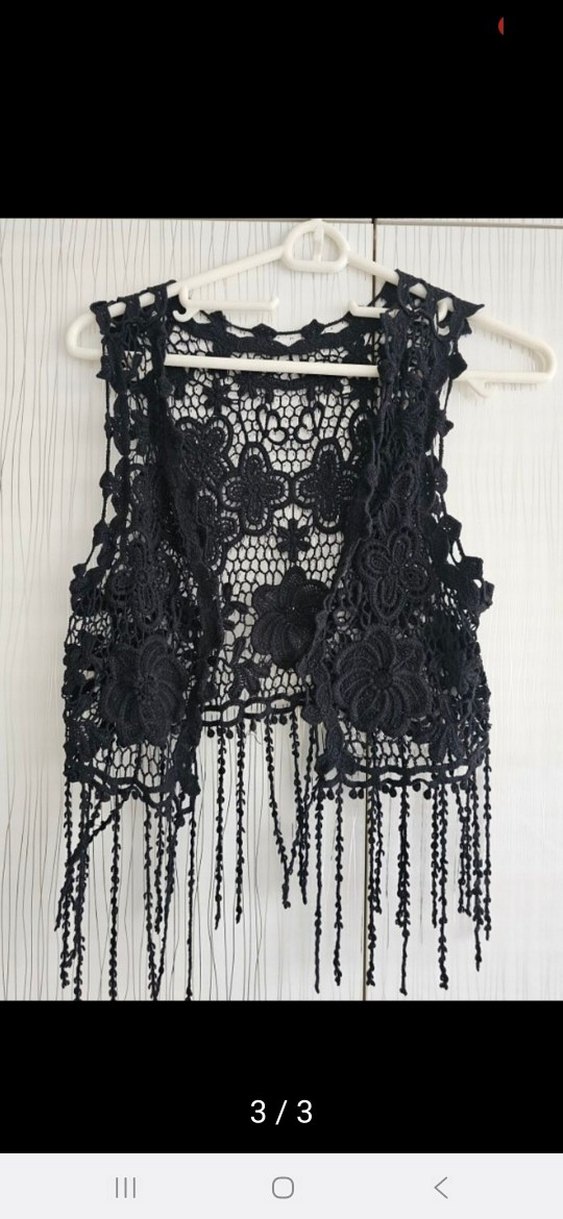 Siyah dantel işlemeli, kolsuz, ince kesim bohem tarzda püskül detaylı yelek