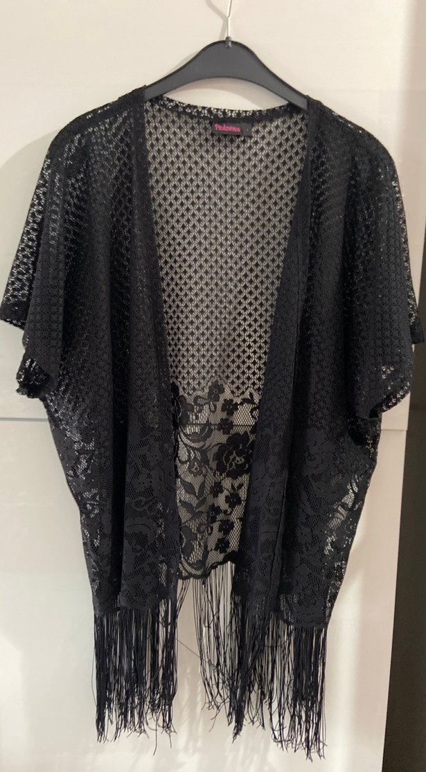 Siyah dantel, kısa kollu, straplez yaka ve bol kesim midi kimono. Desenli kumaş ve püsküllü detaylarla bohem tarzı yansıtır. Bir defa kullanıldı fazlalıktan dolayı iade yoktur Ölçüleri vardır fotoğraflarda