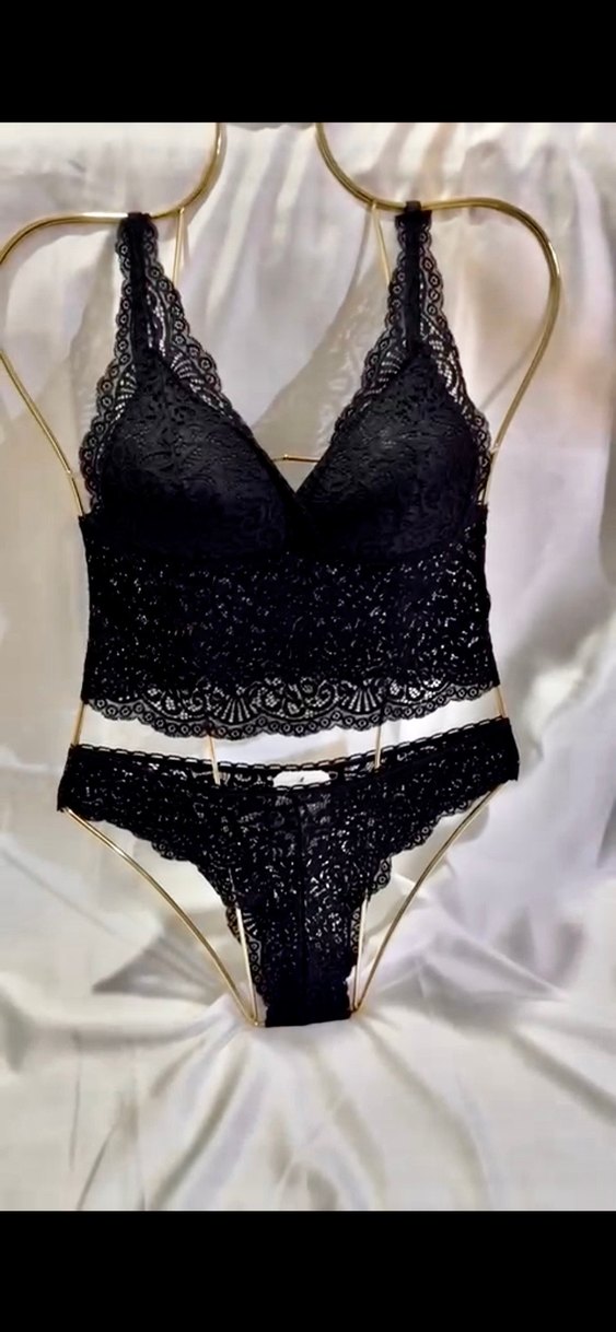 Siyah dantelden yapılmış, gotik tarzda midi uzunlukta sütyen ve külot takımı. Zarif dantel detaylarıyla şık ve karanlık bir görünüm sunar.