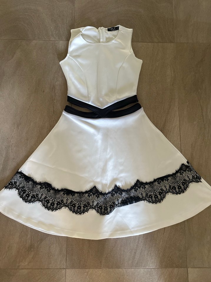 Halter yaka, fitted kesim beyaz elbise, etek ve bel kısmında siyah dantel detaylarıyla modern klasik Paris tarzını yansıtıyor. 1 kez giyildi problemsiz