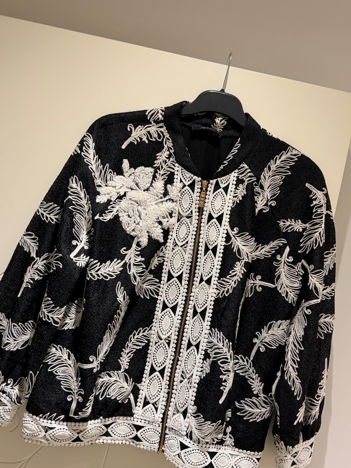 Siyah tekstil kumaş üzerine beyaz dantel ve tüy nakışı bulunan, bohem ve retro tarzı yansıtan kadın takım