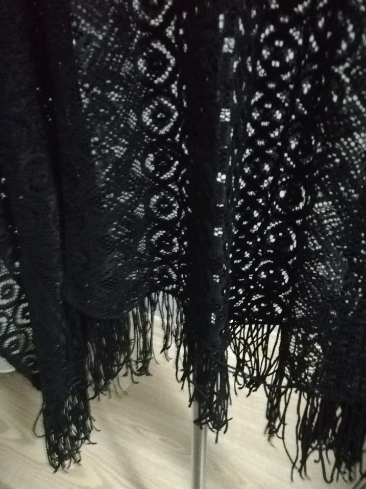 Siyah renkli, dantel detaylı örme kumaştan yapılmış, V yakalı ve kısa kollu, bol kesim uzun boy bohem tarzı pareo. Kol altı dikişli aç tıginda yarasa gibi duruyor.