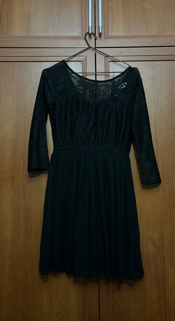 Dantel detaylı, üç çeyrek kollu siyah midi elbise, klasik zarif bir görünüm sunar. Hafif V yaka ve vücuda oturan kesimle romantik akşamlar için uygundur.