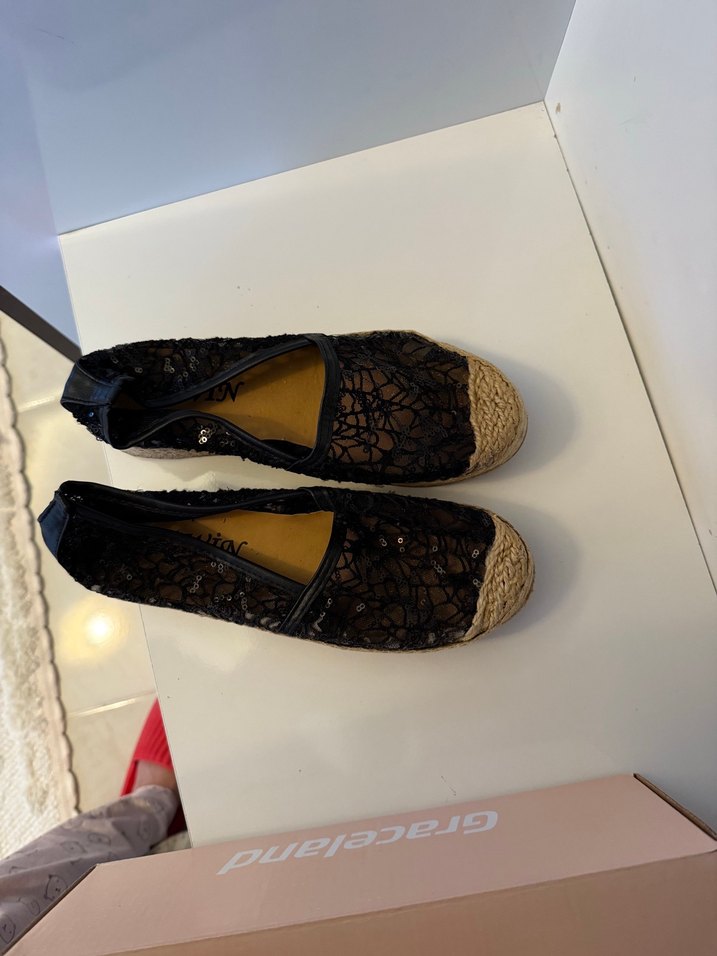 Siyah dantel detaylı, nakışlı ve kauçuk tabanlı dolgu topuk kadın babet, bohem tarzda günlük kullanıma uygun.