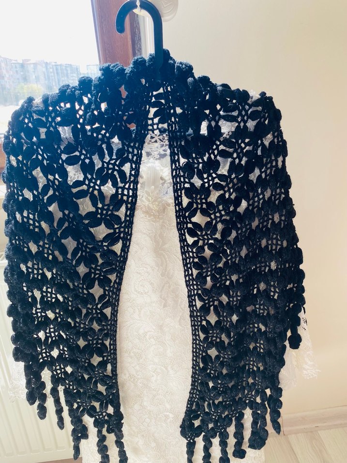 Siyah triko malzemeden yapılmış, dantel detaylı kadın şalı. Gotik tarzda, avant-garde moda tutkunları için uygun. Parlak bir ipi var