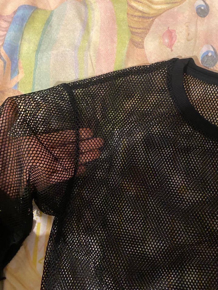 Siyah, dantel detaylı, file kumaştan, bisiklet yaka ve askılı kollu, vücuda oturan bluz. Günlük kullanıma uygun goth ve grunge punk tarzında.
