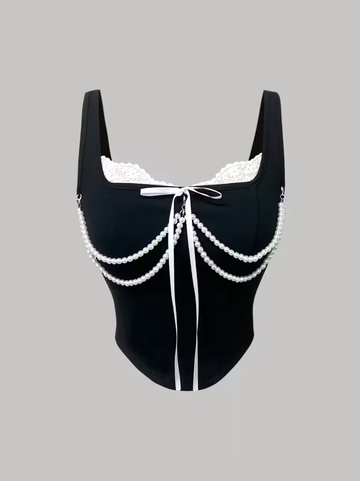 Siyah, dantel detaylı ve inci zincirlerle süslenmiş, ince ve vücuda oturan gotik tarzda bir büstiyer. İpek gibi dokusu ve halter yaka tasarımıyla dikkat çeker.