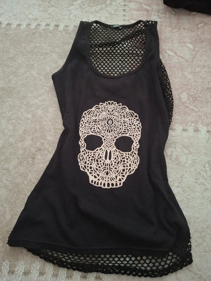 Dantel detaylı, straplez yakalı, baskılı gotik kafatası desenli, siyah, normal boy fitted kadın atlet. S beden Bedeni tam sariyor