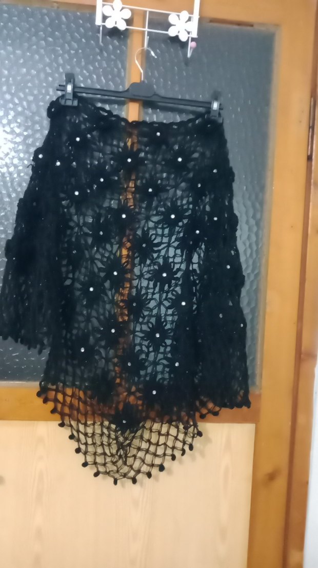 Siyah renkte, dantel detaylı örme kumaştan yapılmış, gotik tarzda kadın şalı. Trend belirleyiciler için şık ve özgün bir seçim. ✨