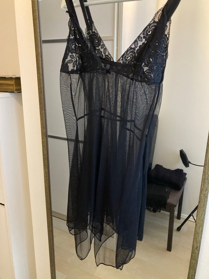Siyah, dantel detaylı, ince askılı ve vücuda oturan gotik stilde midi uzunlukta, transparan kumaşlı gecelik.