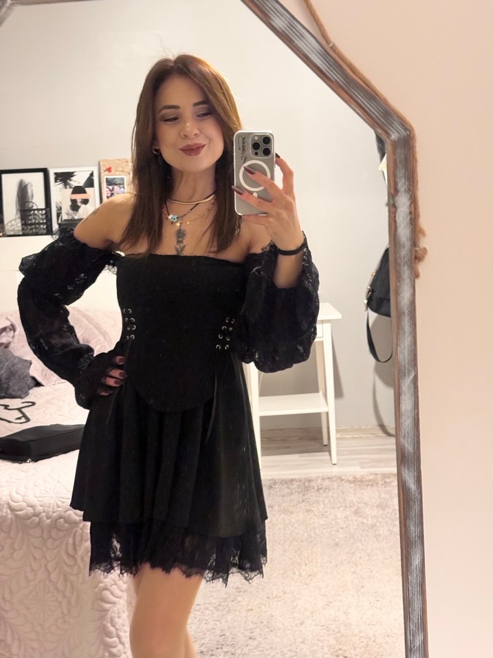 Siyah renkli, dantel detaylı, kayışlı kollara sahip gotik mini elbise. bağlama desenli, salaş kesim ve straplez yaka özelliklerine sahiptir. Uygulamadan etiketli aldım yılbaşı gecesi bi kaç saat kullandım çok zarif bir elbise alana hayırlı olsun