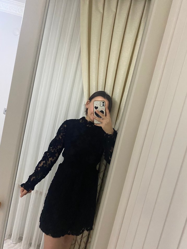 Siyah, yüksek yakalı ve uzun dantel kollu, vücuda oturan midi elbise. Sentetik kumaştan yapılmış, gotik tarzda cesur bir görünüm sağlar.