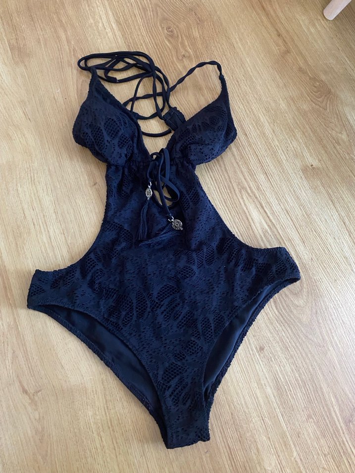 Siyah dantel detaylı, strappy askılı, gotik bohem tarzda, midi uzunlukta ve vücudu saran mayo. şık bir plaj tercihi. Bir sezon kullandım, sıkıntısı yoktur.
