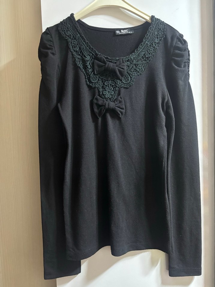 Siyah triko kumaştan, uzun kollu, yuvarlak yakalı, dantel ve fiyonk detaylı, nakışlı, bol kesim günlük kullanıma uygun kadın bluz.