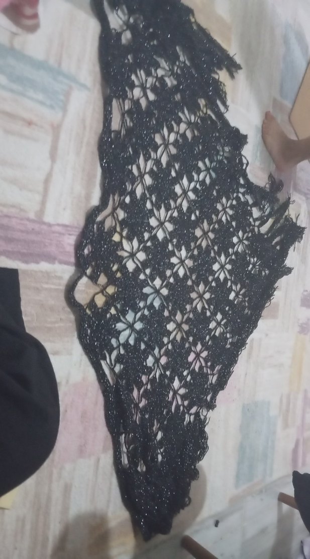 Koyu siyah renkte, dantel detaylı örme kadın panço, gotik ve avant-garde tarzlar için uygun.