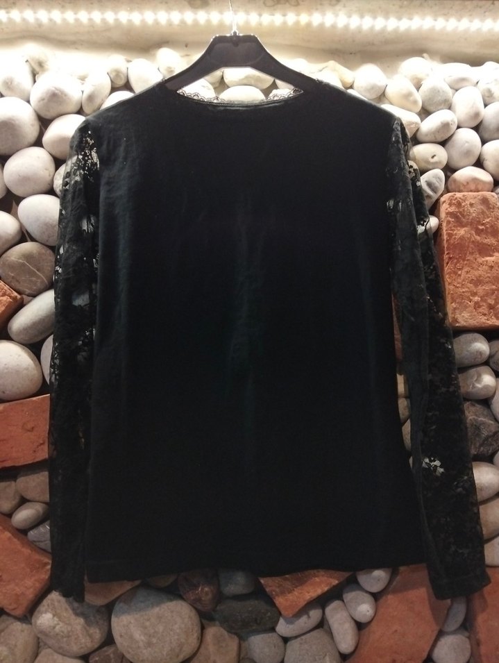 Uzun dantel kollu, yuvarlak yakalı, siyah penye kumaştan yapılmış, vücuda oturan kadın bluz. Gotik tarzıyla parti için uygundur.