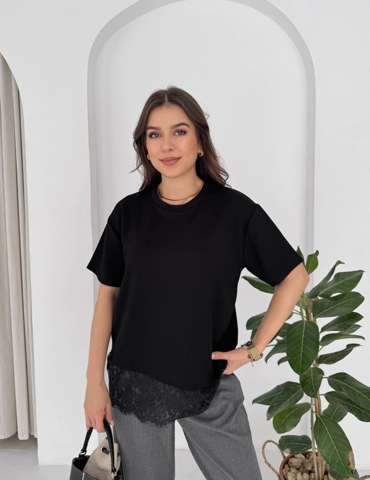 Siyah renk, kısa kollu, bisiklet yaka ve bol kesim kadın tişörtü. Alt kısmında dantel detay bulunur, yumuşak pamuk kumaştan üretilmiştir.