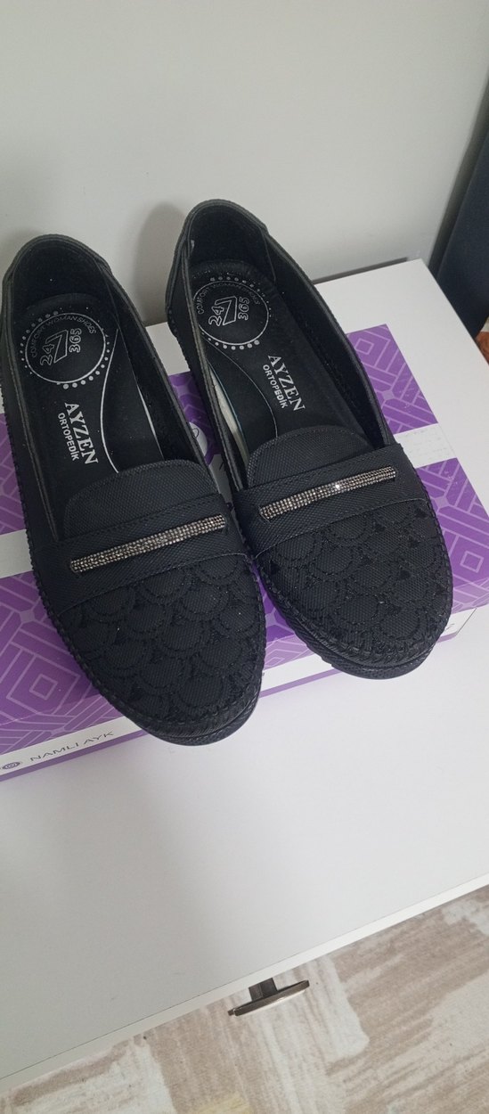Siyah renk, dantel detaylı ve hafif yılan derisi desenli, blok topuklu kadın babet, günlük kullanıma uygundur.