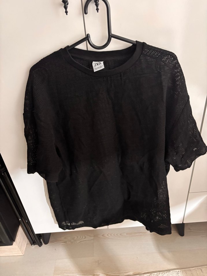 Siyah keten kumaştan, kısa kollu, dantel detaylı ve salaş kesimle günlük kullanıma uygun rahat bir tişörttür.