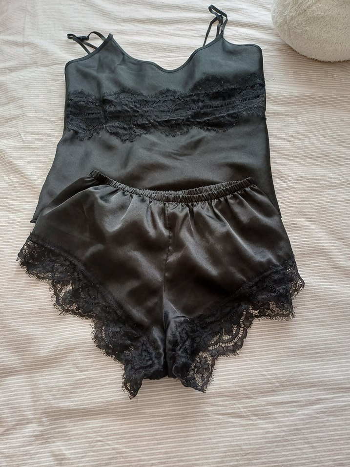 Siyah, dantel detaylı kısa askılı ve şortlu pijama takımı. Gotik stil, yumuşak kumaş ve koyu tonlar içerir.
