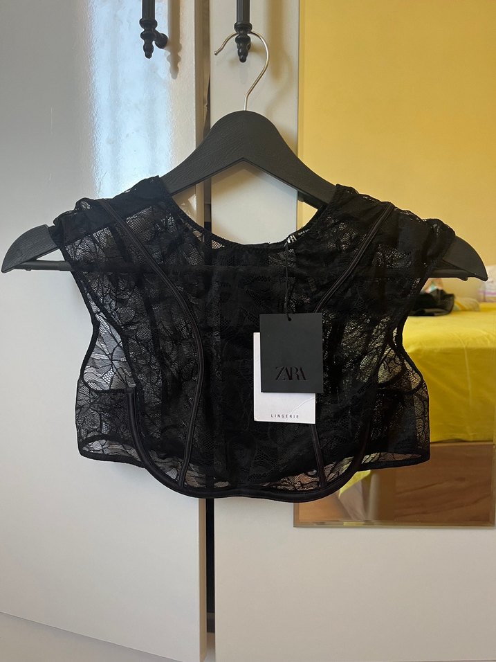 Siyah, dantel detaylı ve baskılı gotik tarzda, straplez ve askılı kısa kesim dar büstiyer. Sentetik kumaştan, günlük kullanıma uygun.