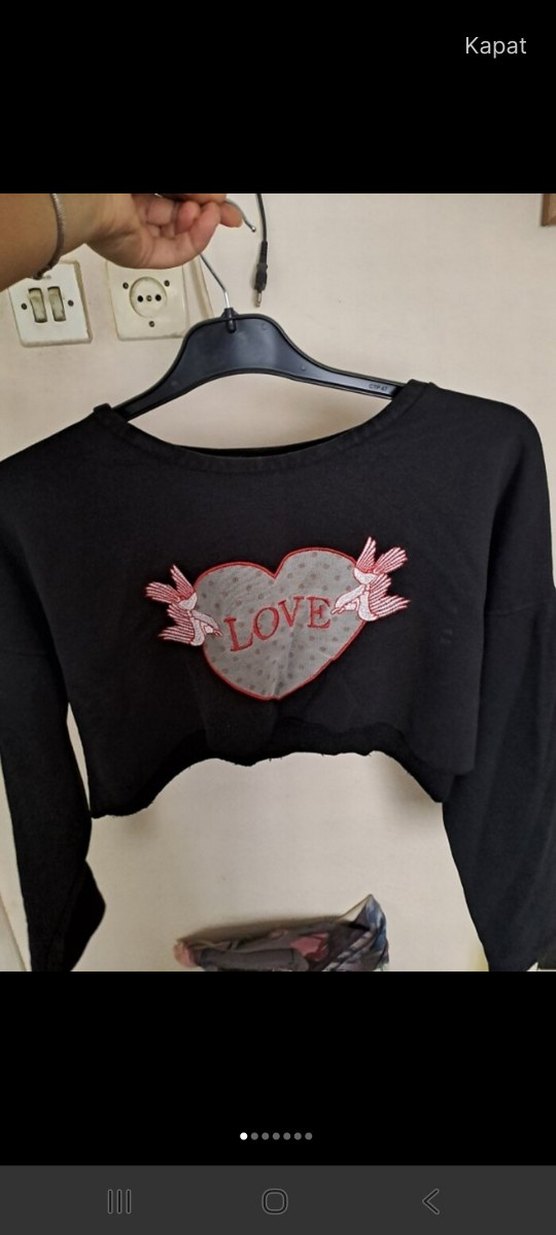 Uzun kollu, yuvarlak yakalı siyah kısa sweatshirt. Dantel kalp aplikesinde LOVE yazısı ve kuş desenleri bulunur. Rahat ve salaş kesimdir.