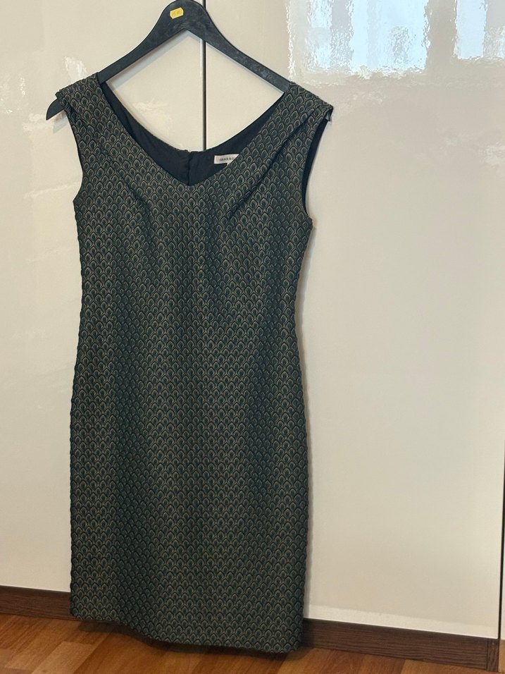 Kolsuz, V yakalı ve vücuda oturan kesime sahip midi elbise, siyah dantel ve hafif yılan deseniyle ofis kullanımı için uygun.