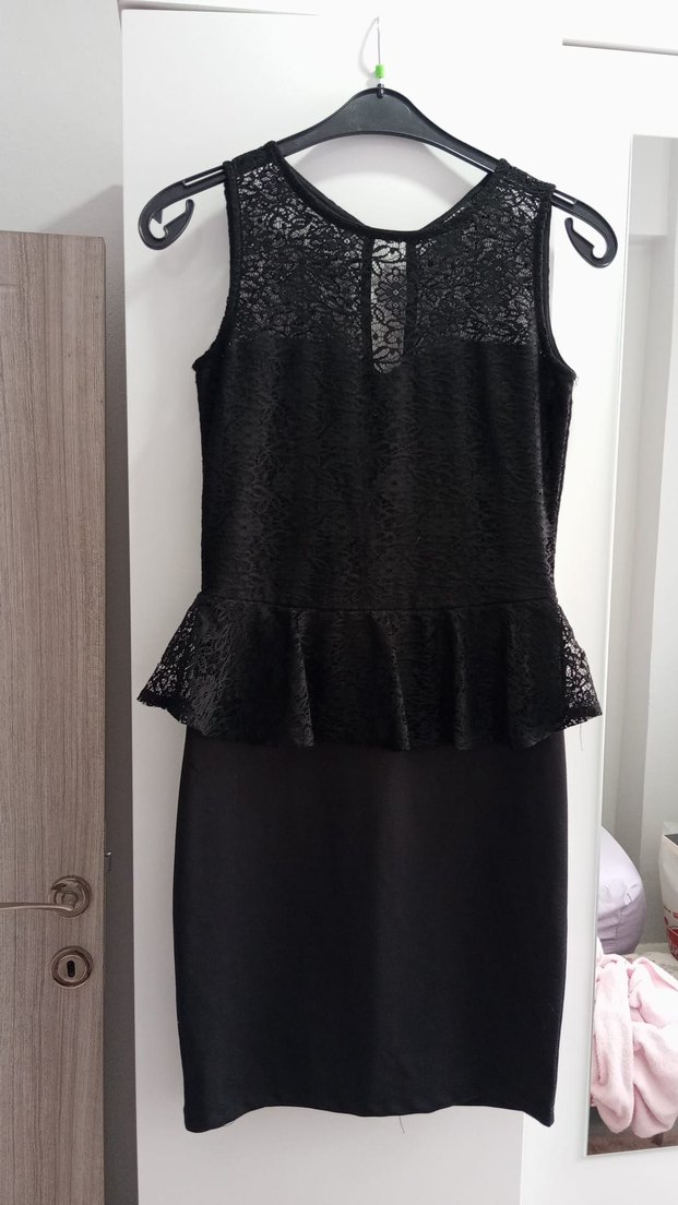 Kolsuz, dantel detaylı siyah midi elbise, V yakalı ve bele oturan, fırfırlı etek ucu ile gotik tarzda.