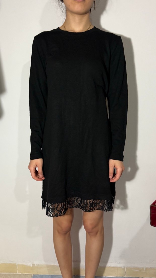 Siyah renkli, uzun kollu ve yuvarlak yakalı triko elbise. Midi boyda, dantel detaylı ve bol kesim tarzıyla günlük kullanıma uygundur.