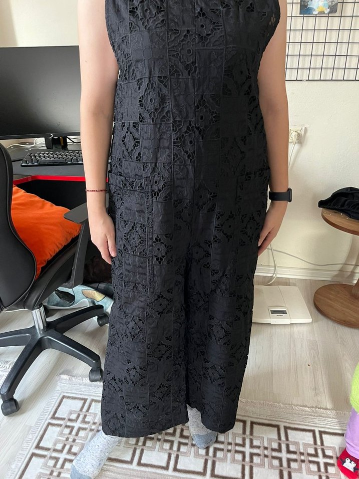 Siyah renkte, dantel detaylı, askısız ve kolsuz, sentetik kumaştan üretilmiş, bol kesim midi tulum.