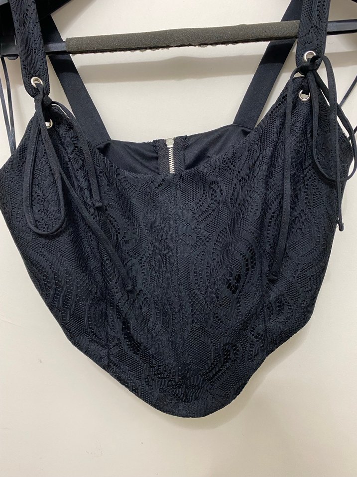 Hiçbir leke veya kusuru yoktur. Sadece yaz tatilinde iki akşam giydim. Siyah renkte, dantel işlemeli, askılı ve halter yaka tasarımlı, kısa boy dantelli dar kesim bir büstiyerdir.