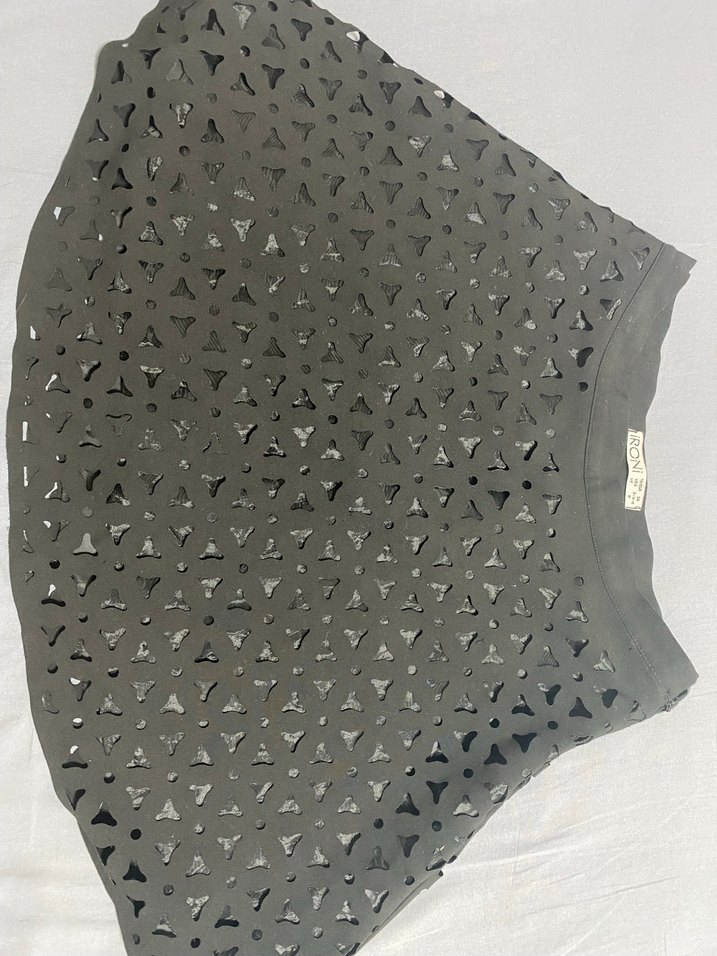 Siyah sentetik kumaştan,dantel detaylı, bol kesim mini etek, avangart dış mekan tarzları için uygundur.